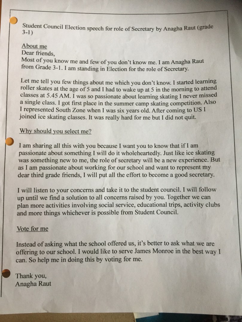 Children / Education / Life in America / Uncategorized Speech for student council elections Grade-3 September 1, 2019 BinduLeave a comment Rate this:Share this: Click to share on X (Opens in new window) X Click to share on Facebook (Opens in new window) Facebook Click to share on LinkedIn (Opens in new window) LinkedIn Click to email a link to a friend (Opens in new window) Email Click to share on Pinterest (Opens in new window) Pinterest Like Loading... Related